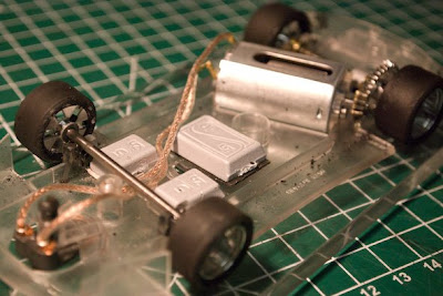 Op de baan ermee - maar dat valt tegen...het lijkt wel of er iets aanloopt. Nagekeken en, jawel hoor. De bandjes lopen aan tegen stukken van het lexan interieur. Hier al weggeknipt - stom, ik had eerst een foto moeten maken - maar het is nu ook wel duidelijk denk ik.